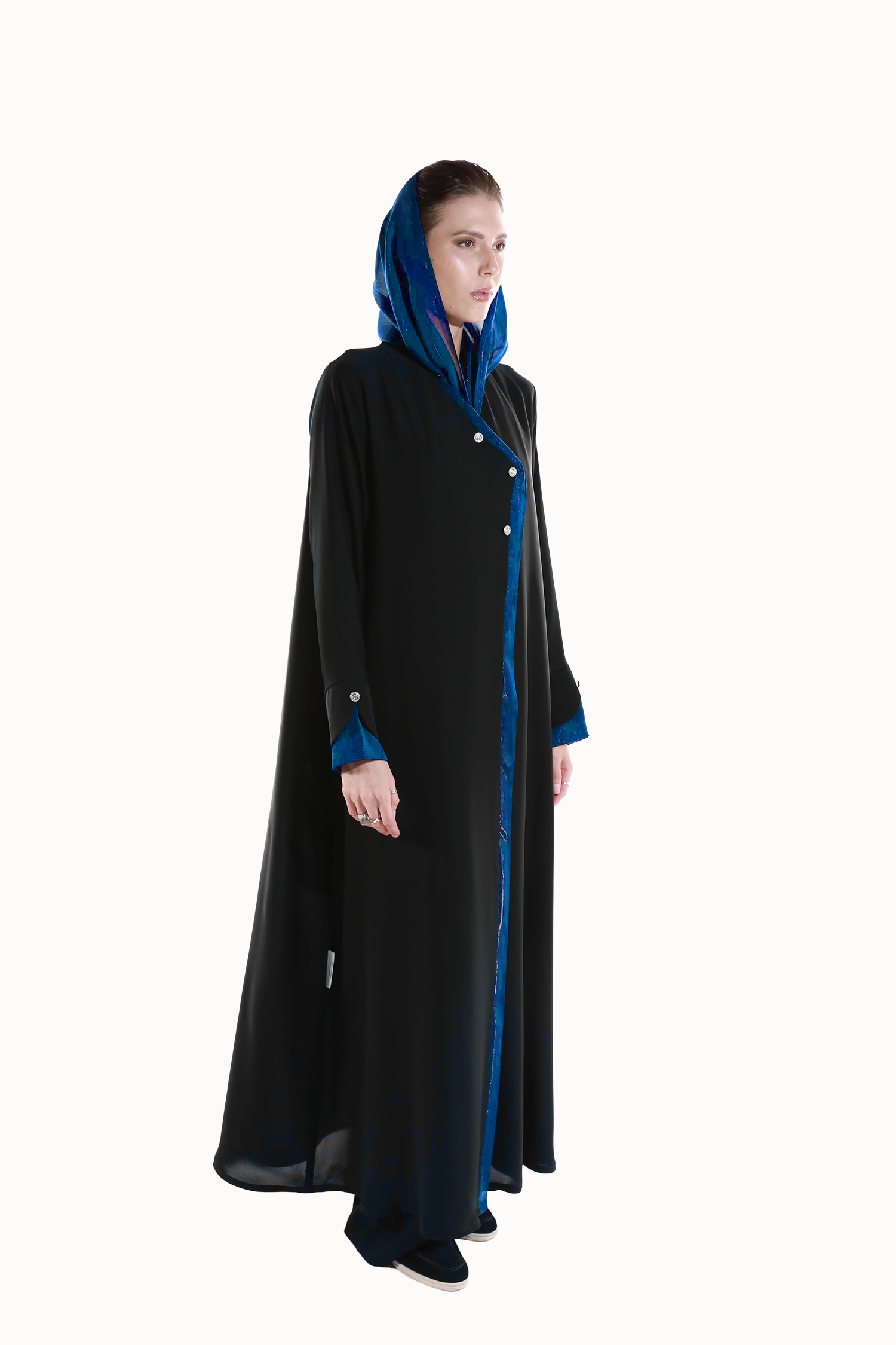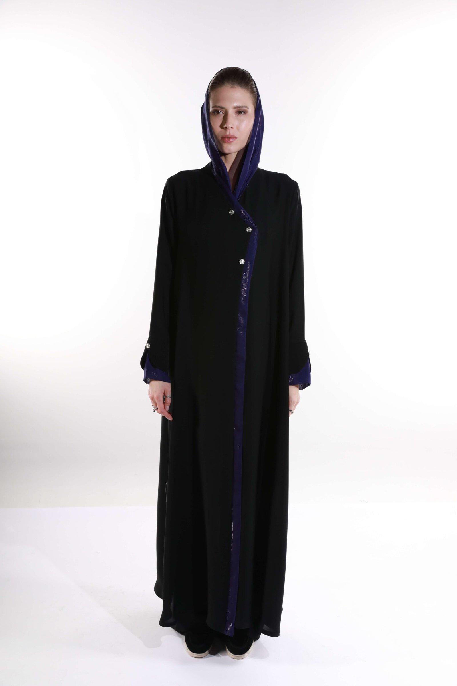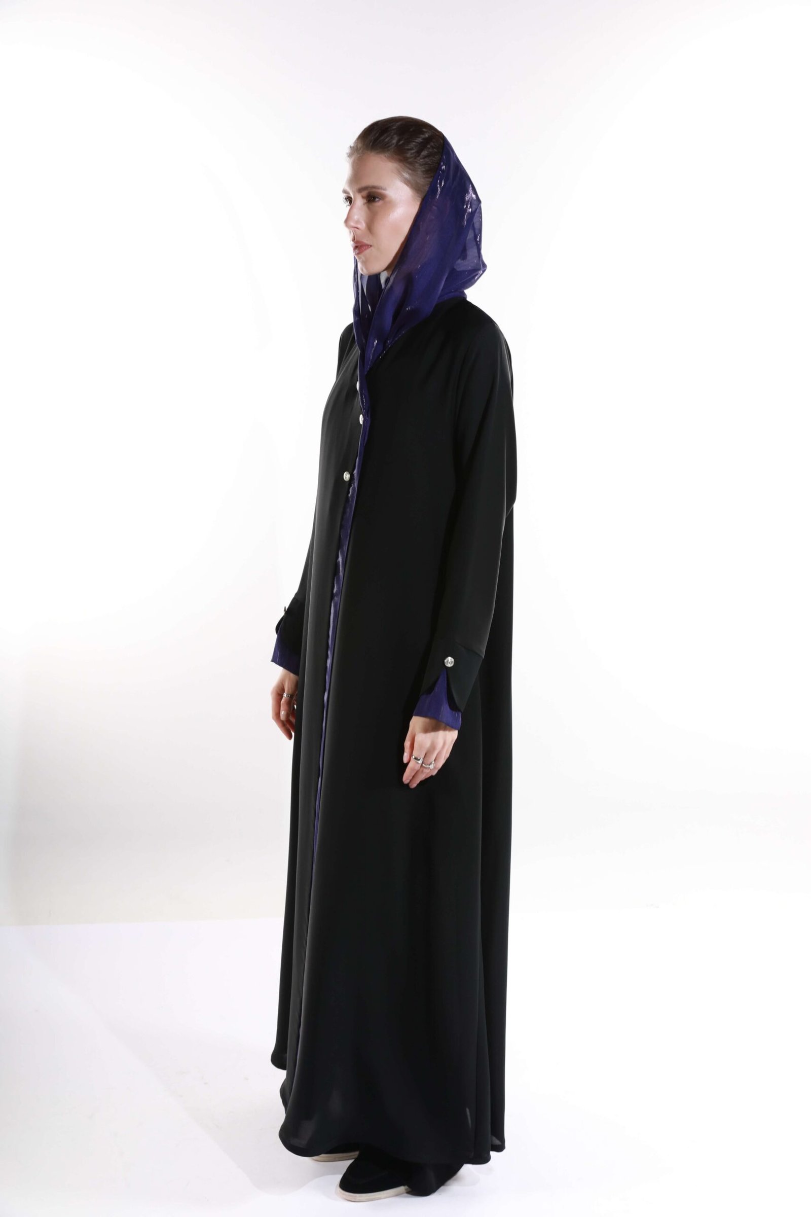 تصميم من قماش أسود فخم، تتداخل معه حواف بنفسجية لامعة تضيف تميز وجاذبية لافتة. تكتمل الإطلالة بشيلة بنفسجية متناغمة، فيما تضيف الفتحتان الجانبيتان انسيابية ولمسة توازن أنيق. قطعة تجسد الأناقة ، وتجمع بين الهيبة والرقة بأسلوب عصري يعكس تناغم راقي في كل تفصيل.