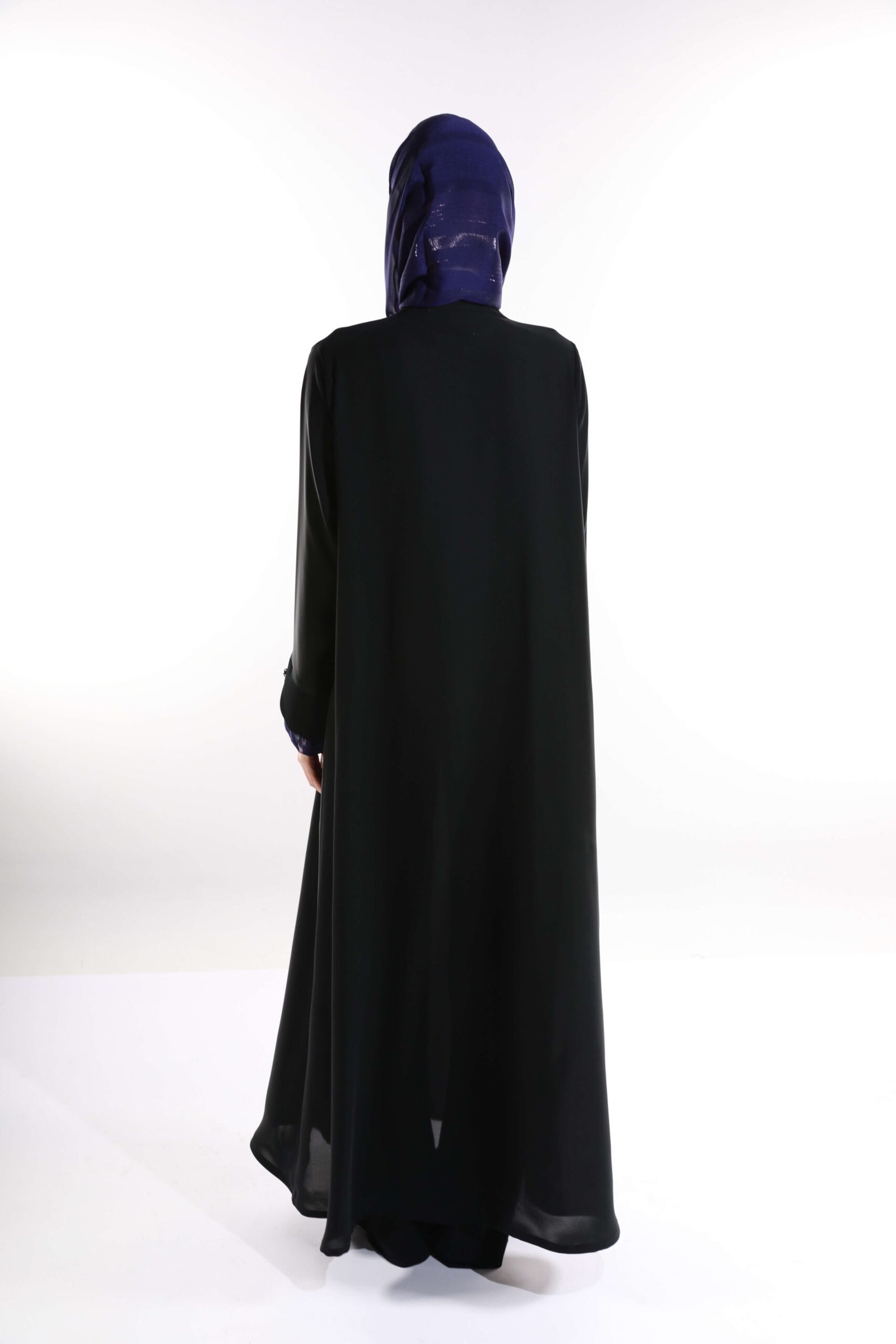 A refined design crafted from luxurious black fabric, with aesthetic violet tones and subtle glittery edges that add a touch of distinction. The look is completed with a matching violet sheila, while two side openings create a graceful flow and balanced silhouette , a piece that embodies quiet elegance, blending strength and poise in perfect harmony.