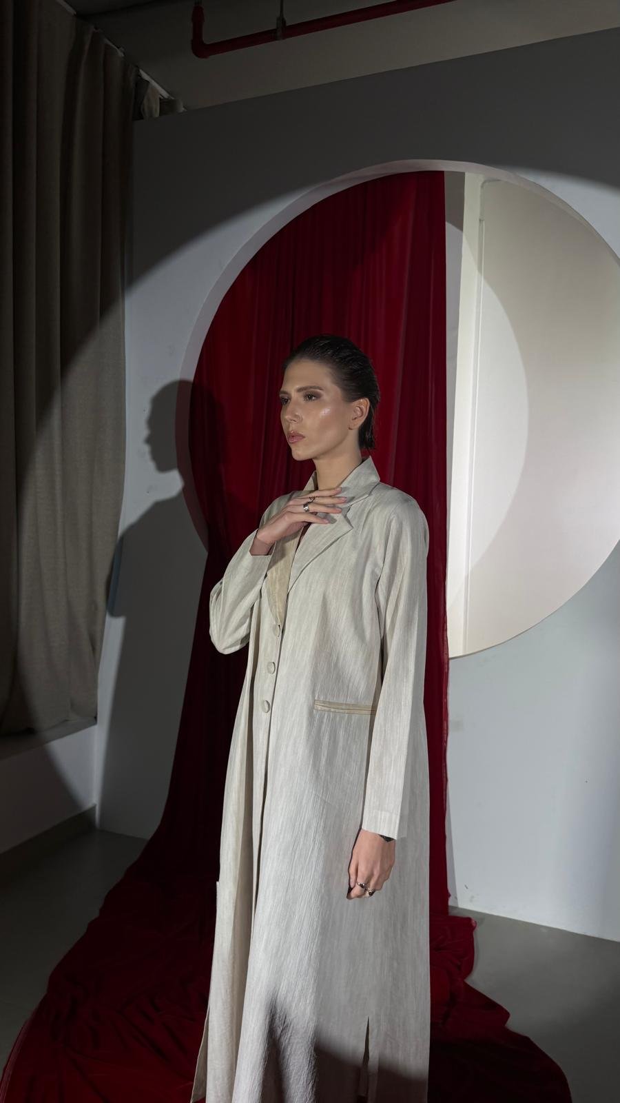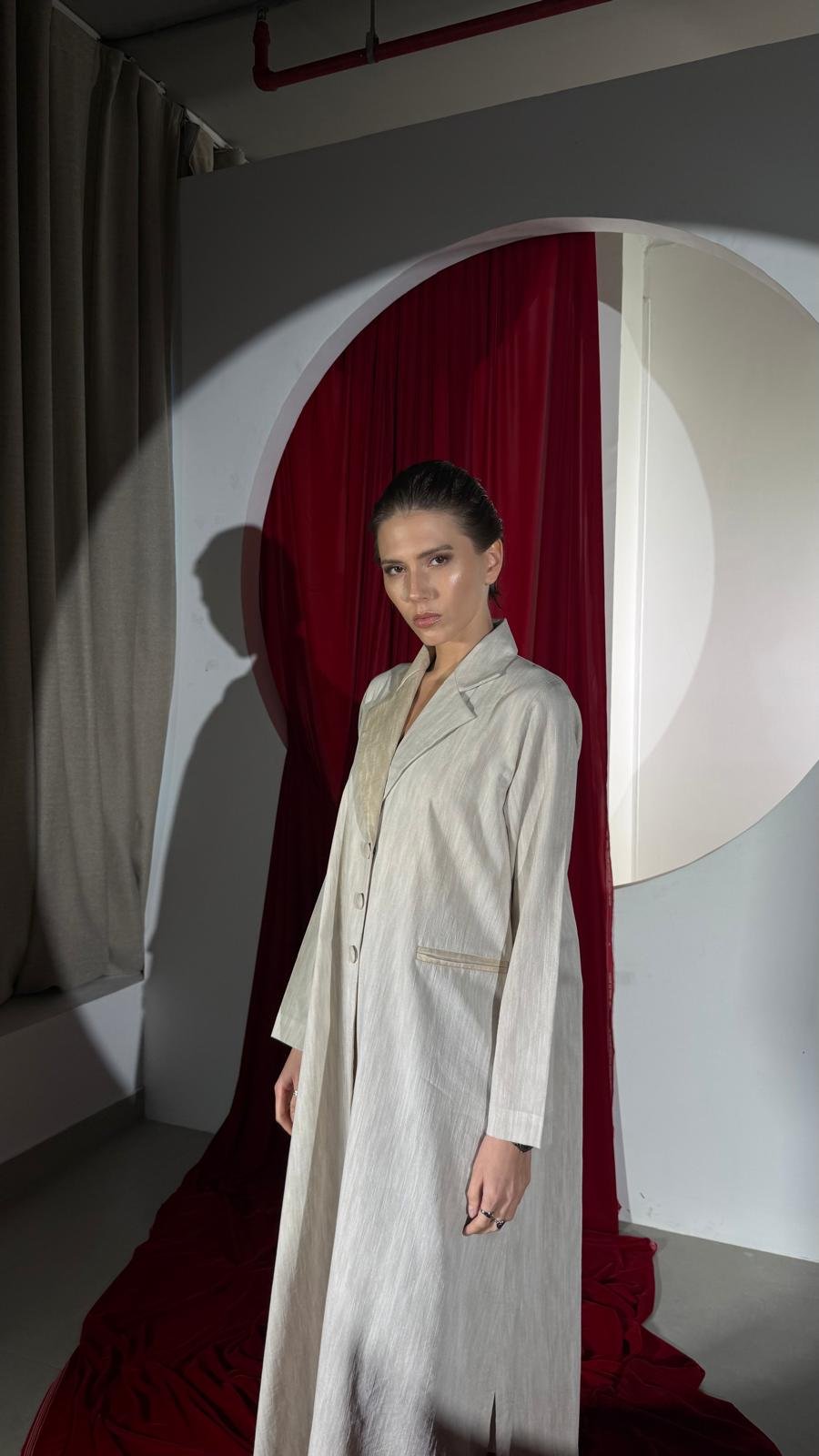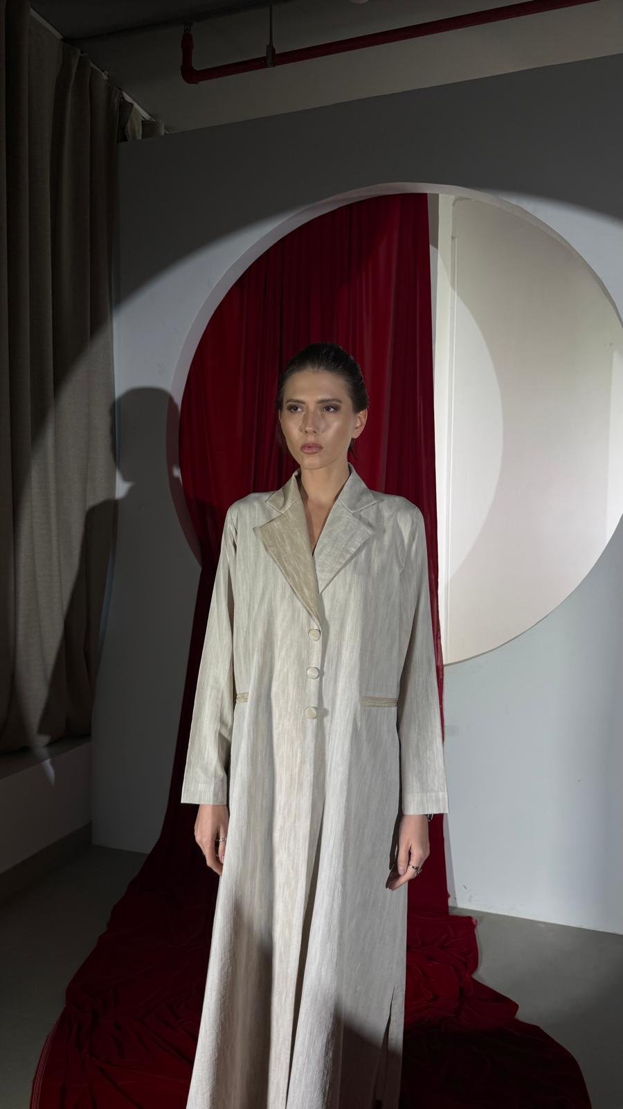 تصميم راقٍ بلونٍ بيج رملي مستوحى من دفء الصحراء وتموّج الكثبان المتحركة بهدوء وأناقة. يتميز البليزر بأزرار أمامية تعكس أناقة بسيطة تناسب جميع المواسم.
