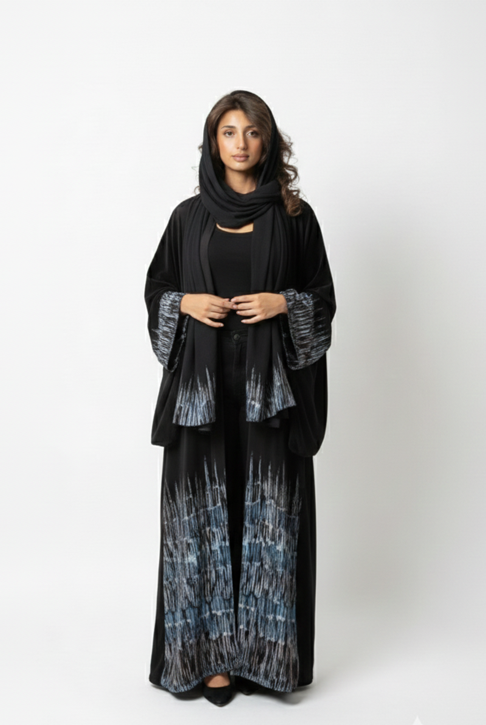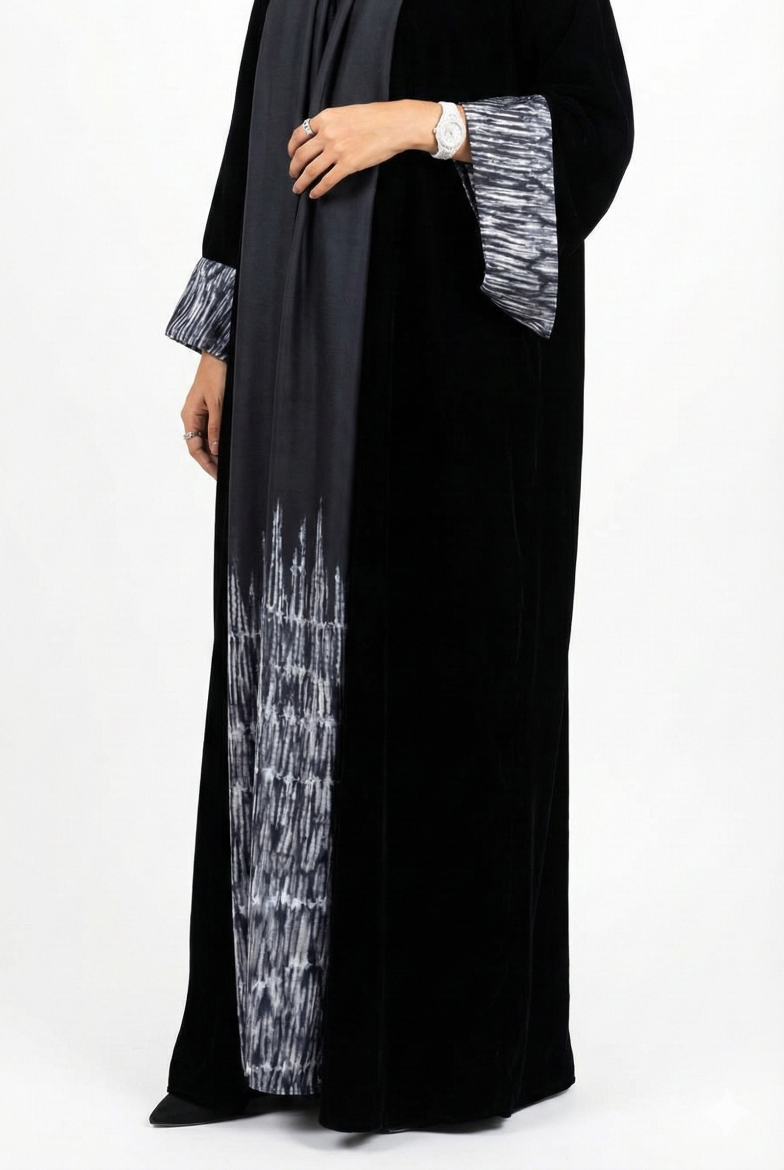 A velvet bisht-cut piece defined by fluid, dynamic strokes that flow seamlessly across the fabric.